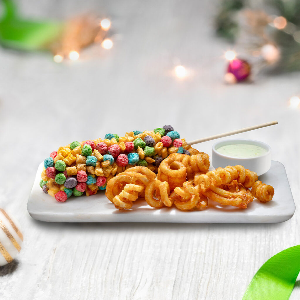 - Stick a Doodle Corn Dog: Corn dog coated in cheddar cheese sauce and cereal, served with curly fries